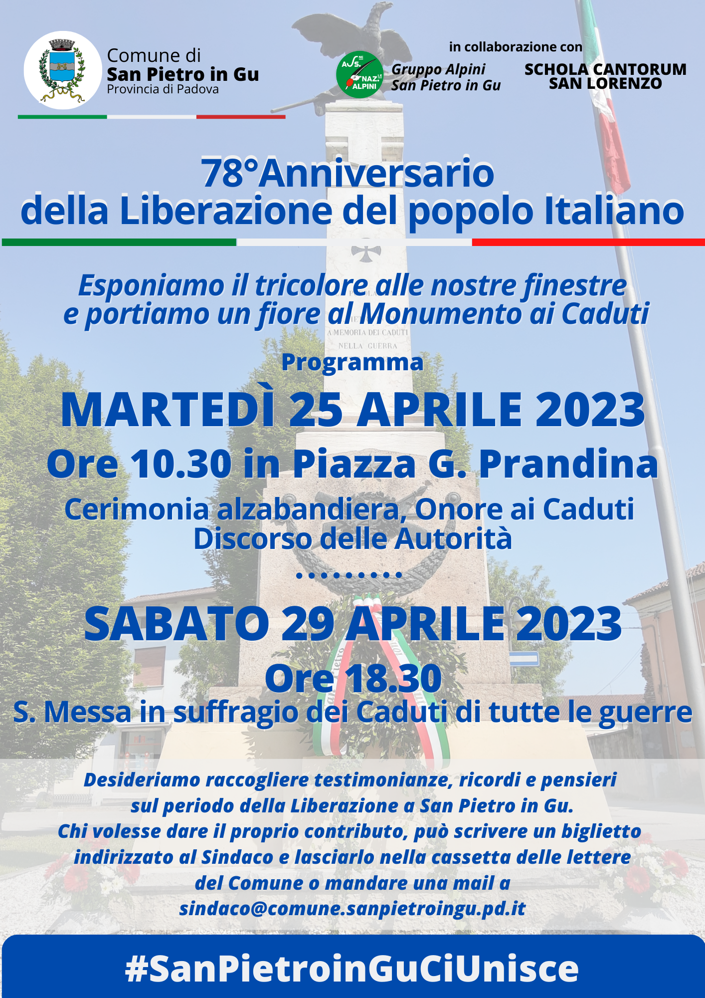 Desideriamo raccogliere testimonianze, ricordi e pensieri sul periodo della Liberazione a San Pietro in Gu. Chi volesse dare il proprio contributo, può scrivere un biglietto indirizzato al Sindaco e lasciarlo nella cassetta delle lettere del Comune o mandare una mail a sindaco@comune.sanpietroingu.pd.it